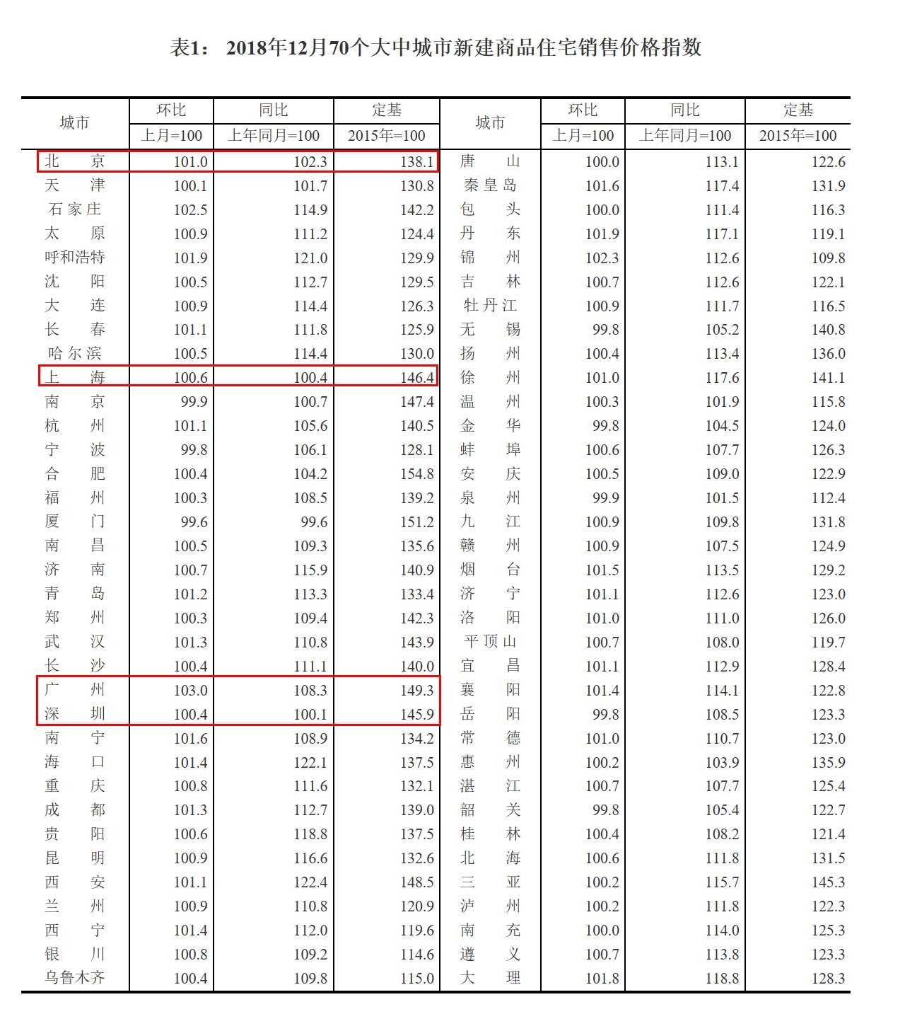 2018年12月份70個(gè)大中城市商品住宅銷售價(jià)格變動(dòng)情況。圖片來(lái)源:國(guó)家統(tǒng)計(jì)局網(wǎng)站